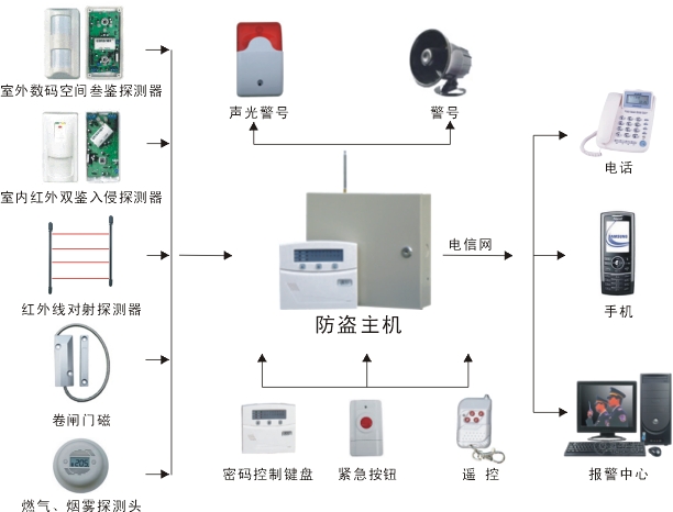 红外报警系统由报警主机和红外探测器组成;一般分为分主动式和被动式两种;当有障碍物阻挡了这根看不见的红线的时候,探头就会检测到有异常,触发报警。报警主机还有时间显示、报警记录查询、自动开关机等功能。在需要防范的区域安装好探测器之后,可以通过设置键打开或关闭监控报警功能,如果有盗贼进入防范区域,探测器就会探测到人体红外线,并立即发射经数字编码的报警信号,该信号由安装在一公里以内的红外线报警器接收后,立即发出刺耳的警报声,惊吓盗贼,提醒安保人员,还可根据红外线报警器面板上的报警提示灯,明确知道报警地点。